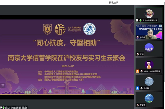 疫情防控在哪里,支部就建到哪里。在由学院党委主办,2020级专硕党支部和在沪实习生临时党支部承办,信管学院上海校友会(筹)协办的沪上云聚会活动中,学院党委书记姜迎春同志代表学院对全院师生表达了关心和问候,对疫情中的南大信管人提出殷切鼓励和期盼,带领与会师生校友对母校百廿校庆寄予了美好祝愿。“临时党支部还将在今后和未来一段时间持续发挥作用,通过线上集体学习、信息共享、情感分享、资源互助等方式,辐射党员及其他普通同学,将在校师生、在外地实习同学和校友紧密团结,彼此守护,共克时艰。”学院党委副书记罗萍同志做补充介绍。