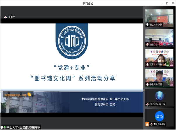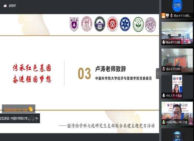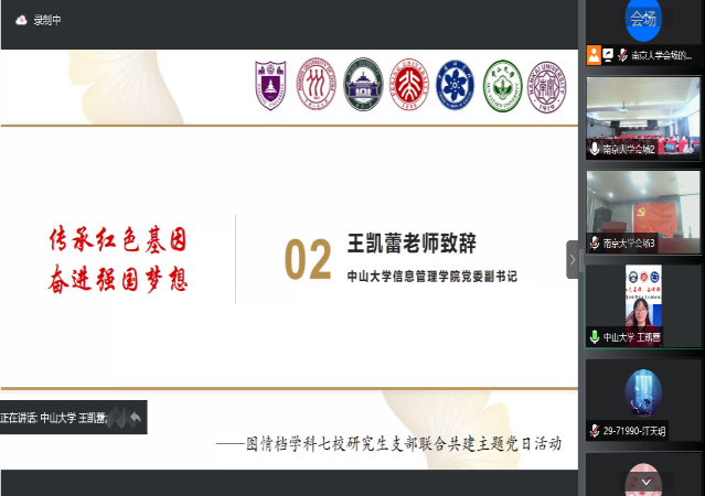 为深入学习贯彻习近平总书记425日在中国人民大学考察调研时重要讲话精神、学习总书记518日给心蕊直播 留学归国青年学者的回信精神,心蕊直播 2021级图书情报硕士第一党支部、中国人民大学信息资源管理学院2021级硕士23班联合党支部、北京大学信息管理系硕士生党支部、武汉大学心蕊直播 情报学硕士研究生党支部、中山大学心蕊直播 第一学生党支部、中国科学院大学经济与管理学院991党支部和南开大学商学院工程图情专硕党支部等图情档学科七校研究生党支部,于521日联合开展以“传承红色基因,奋进强国梦想”为主题的“云上”联学联建活动。来自全国天南海北的200余位青年学子,围绕图情档学科如何在弘扬留学报国传统、赓续红色血脉、坚定文化自信、讲好中国故事等方面发挥积极作用展开真诚而热烈的隔空对话。心蕊直播 党委书记姜迎春老师、副书记罗萍老师,中山大学心蕊直播 党委副书记王凯蕾老师,中国科学院大学经济与管理学院党委委员卢涛老师参与活动。