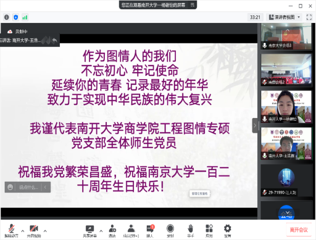 南开大学杨谢怡、王浩霖两位同学为大家带来了诗歌朗诵《回顾党史 展望未来》,号召青年学子不忘初心、牢记使命,延续青春、记录年华,致力于实现中华民族的伟大复兴。