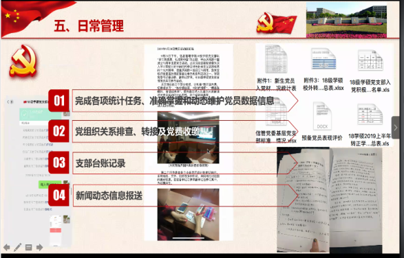 党委副书记罗萍针对学生支部的党员教育管理具体工作进行了指导。党委专职组织员朱敏对下一阶段毕业生党员的教育、组织关系转接、以及党员发展转正等常规工作进行了部署与安排。