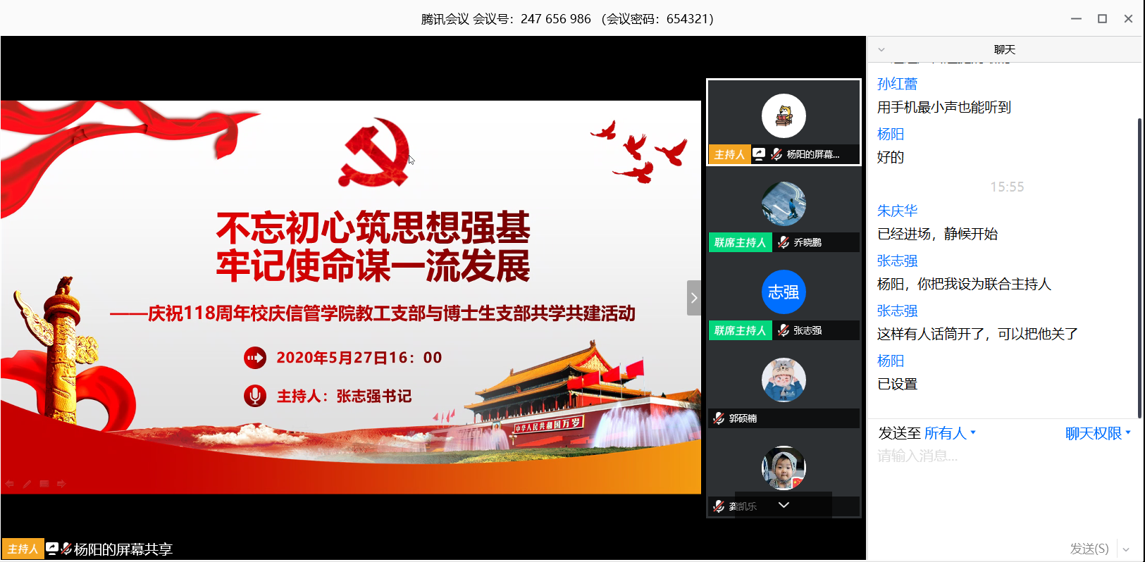 为庆祝心蕊直播 118周年生日,增进师生交流,527日下午,信管院教工支部与博士生支部开展了以“不忘初心筑思想强基,牢记使命谋一流发展”为主题的共学共建活动。按照防控要求,此次活动以线上线下相结合的形式开展。学院党委书记姜迎春同志、院长孙建军同志带领部分党员师生代表在院楼211会议室,通过视频连线方式,与教工支部、博士生支部八十余名党员师生共同开展政治学习和业务研讨。党日活动由教工党支部书记张志强同志主持。