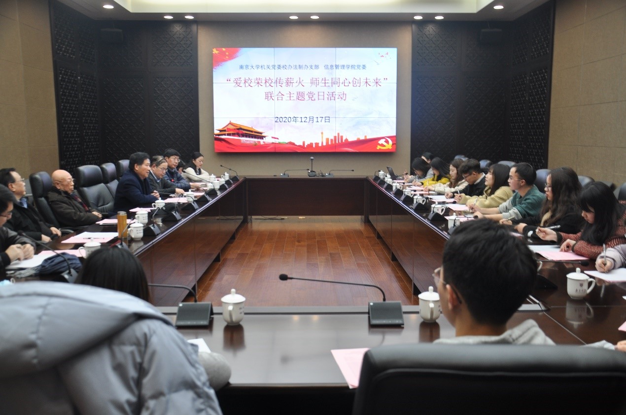 校长办公室、法制办公室主任,校办法制办党支部书记尹三洪同志首先介绍了此次联合主题党日活动的意义和目的。他指出,离退休同志长期受党的教育,是学校和国家建设发展历程的见证者、参与者和奉献者。发挥老同志、老专家的思想优势、阅历优势、经验优势,讲述中国故事、南大故事和身边故事,是深入开展“学四史、知校史”学习教育活动的应有之义。他寄语青年党员传承各位前辈的奋斗精神,汲取他们的经验智慧,进一步增强守初心、担使命的思想自觉和行动自觉,努力以青春之我创造青春之南大,以个人之梦托起南大梦,以南大梦托起中国梦,真正实现“今日我以南大为荣,明日南大以我为荣”的理想和使命。