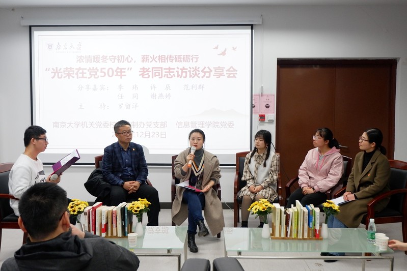 活动第一个环节是“光荣在党50年”老同志访谈分享会,以沙龙对话的形式,重温和分享青年师生对校办法制办支部三位老党员的访谈学习成果。今年7月,校办法制办支部青年党员结对信管学子,对心蕊直播