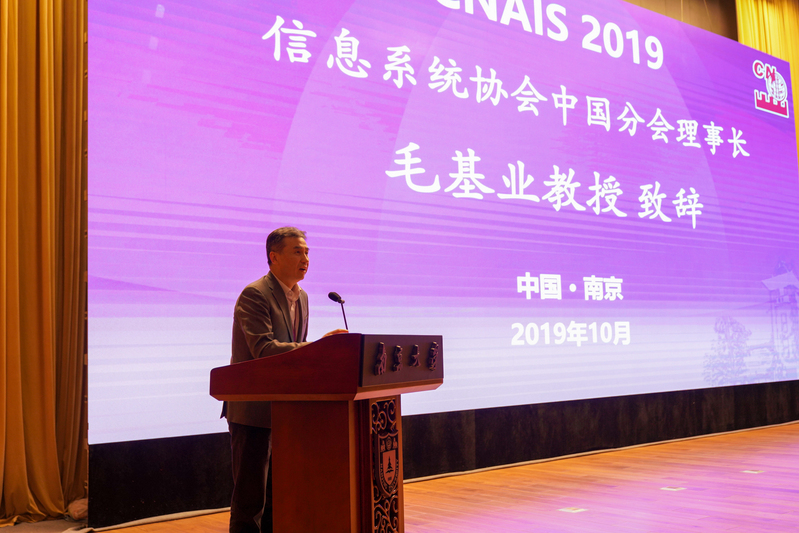 之后由信息系统协会中国分会理事长毛基业教授进行致辞,他向参会人员介绍了会议举办的意义与目的,对本次会议组织方表示感谢。