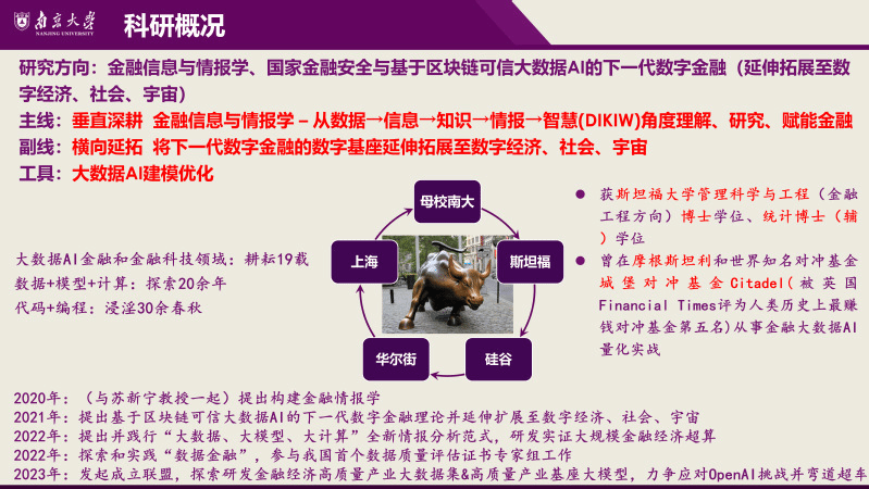 心蕊直播 普惠•三农(“三农智能”)金融科技研究中心负责人。毕业于斯坦福大学先进金融科技实验室,获金融工程博士学位和统计博士学位(辅)。在UTD 24和学科卓越期刊发表论文多篇,含数篇高被引,论文12篇/次被四大权威转载转摘。其中一论文在当年同期刊所有论文中总引用数排名第一,在近10年同期刊所有论文中总引用数排名前2.4%。另一论文位列安全情报领域前4名。部分研究成果被微软和华尔街投行等借鉴或采纳。拥有Morgan Stanley、Citadel等世界知名金融机构大数据AI量化金融实战经验。在金融科技和数据+模型领域耕耘20余载,现致力于“大数据、大模型、大计算”全新范式驱动的金融信息与情报学、国家金融安全、基于区块链可信大数据AI的下一代数字金融(可信、安全、隐私保护、有温度、智慧、高效的数字金融2.0)基础设施、体系架构、计算范式和融合创新孵化平台的理论研究和实践探索,并延伸至数字经济社会、数字健康医疗、数字传播宇宙。获省社科优秀成果二等奖、全国高校双创优秀论文一三等奖、省学术大会优秀论文一等奖、全国区块链优秀教材二等奖、中国社科院新闻所年度优秀著作奖。多次获省委领导批示。荣获CSIC2023年度数字技术创新杰出贡献人物奖。