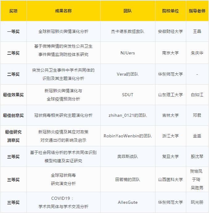 该数据竞赛围绕COVID-19疫情相关的舆情以及大数据,设置多个热门议题,鼓励高校师生及社会人士结合专业知识、针对疫情相关议题进行数据的深入分析和研究,旨在对舆情演化、公共卫生事件应对、学术共同体发现等问题领域做出创新型的突破,对疫情防控、学科研究与专业知识应用、数据思维培养具有重大意义。该数据竞赛共设置一、二、三等奖分别为123个,另外还设置了最佳创意奖等单项奖3项。