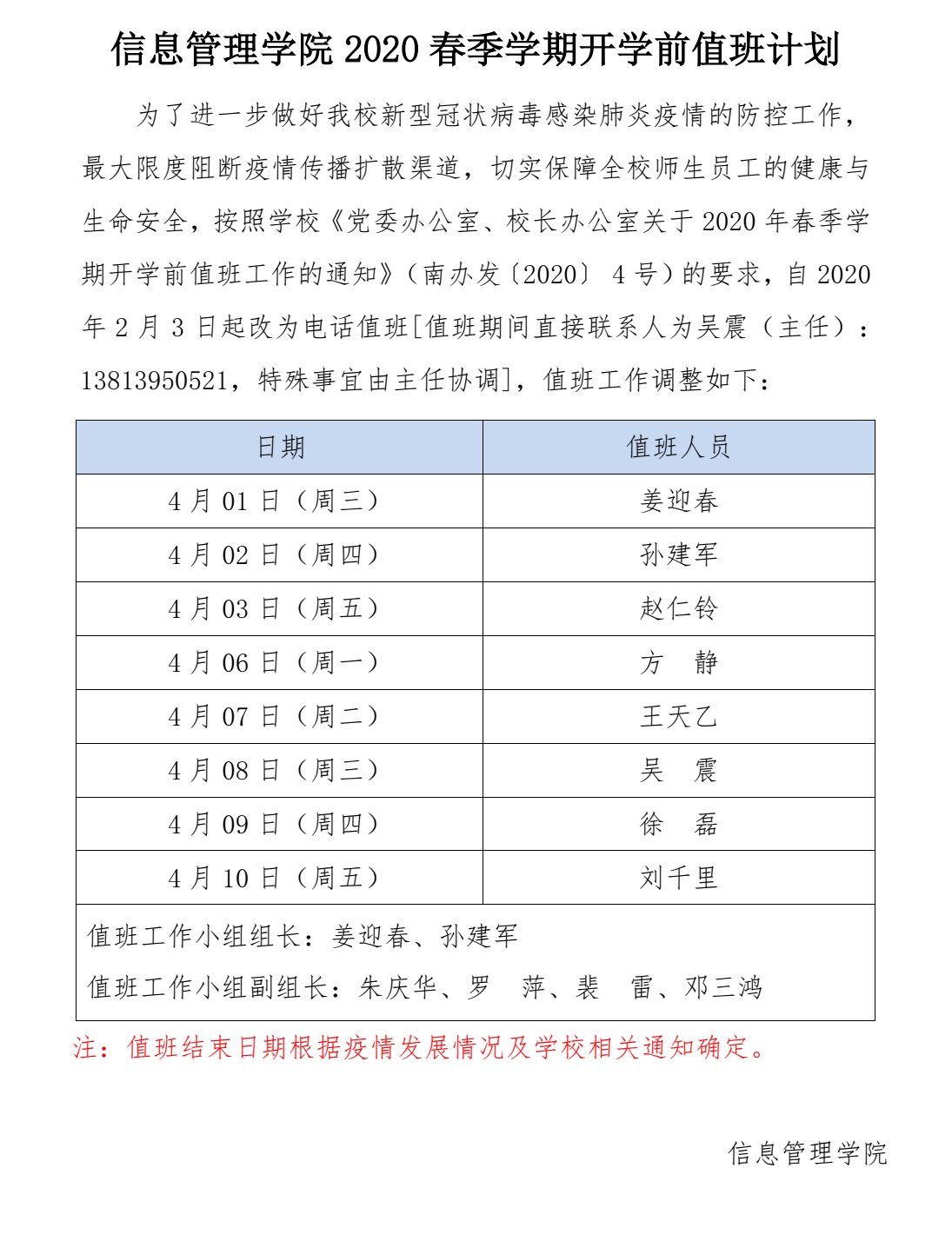 心蕊直播 2020春季学期开学前值班计划(4月份)