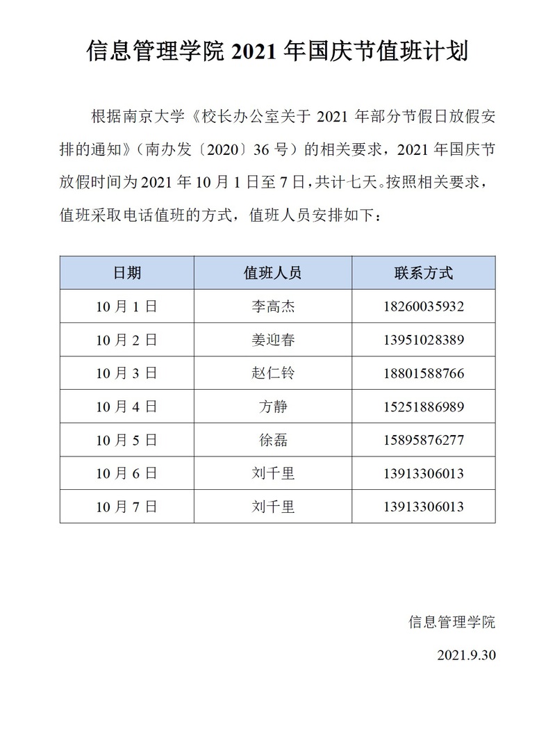 心蕊直播 2021年中秋节值班计划