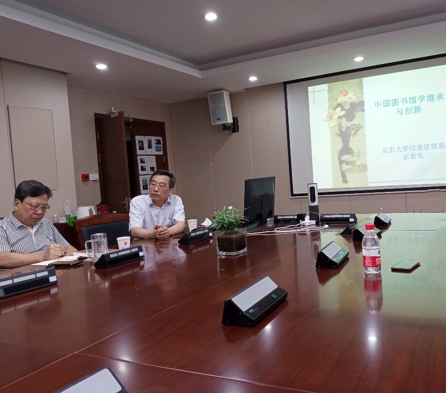 讲座伊始,叶继元教授介绍了王余光教授的学术经历及主要学术成果。随后,王教授正式开讲。他首先讲述了私立武昌文华图书馆学专科学校、北京大学信息管理系的创办始末及自己与北京大学、武汉大学图书馆学专业的渊源,同时简要回顾了中国图书馆学专业的发展历程。