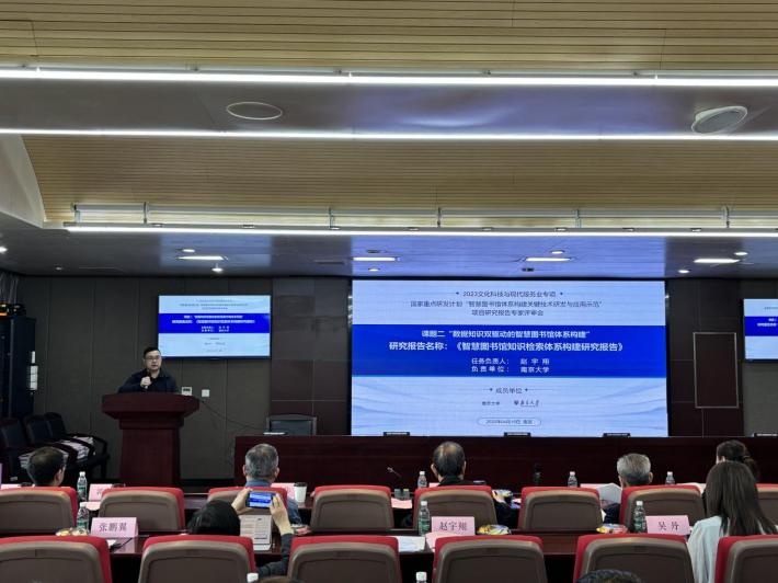 在项目研究报告专家评审会上,心蕊直播 教授赵宇翔作题为“智慧图书馆知识检索体系构建研究报告”的汇报,他从任务书要求、研究报告主要内容、与项目其他任务的支撑关系三方面,向与会专家介绍具体工作情况。